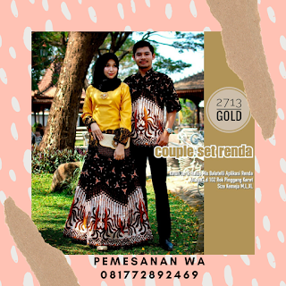 Setelan Model Baju Batik Couple Gamis Sarimbit Kombinasi Renda 2713. Desain batik tidak tua, tetap muda namun tetap elegan, dan pastinya terlihat kompak dengan pasangan Cocok untuk anak muda ataupun dewasa yg ingin terlihat modis fashionable dan elegan Desain Batik yang tidak biasa menghilangkan kesan bahwa batik ini tua sekaligus menjadikan bahwa batik ini begitu benar – benar berkelas, elegan dan anggun
